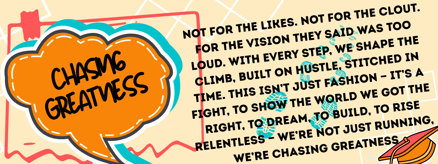 Its a tribute to the journey — a chronicle of greatness in motion, told through fabric and fit. It honors the grind of late nights and lectures, the beauty of moments only campus can give: the parties, the slang, the struggles that sharpen you, the steps toward independence, the milestones that shape your name. It is fashion as memory, style as a storyteller, a celebration of every chapter you live while CHASING GREATNESS.